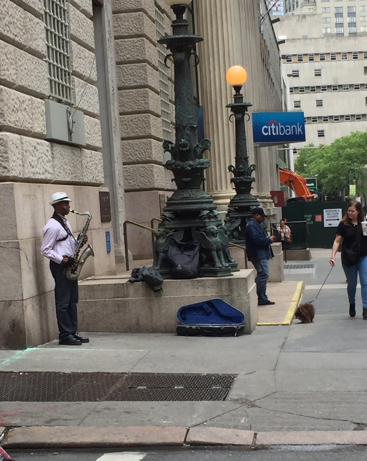 Lonely saxophone music, like a gong in a monastery, brings me to awareness, reminds me that I am really here. This is who I am. This is who I am now. Brynna in the Big City. Maybe it is too hot for him to play today.