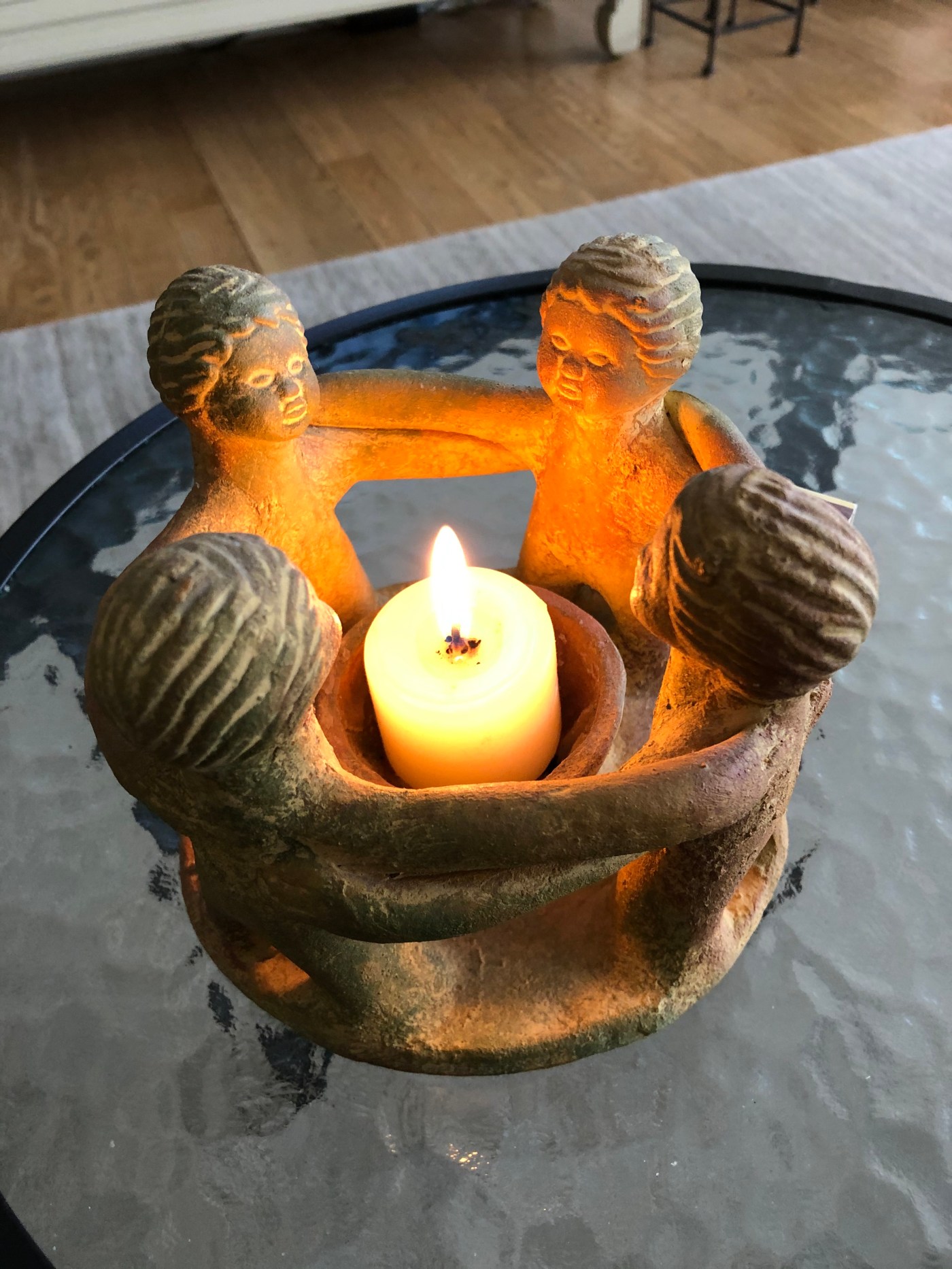 After we wrote for about twenty minutes, I looked up from my paper at Rosemary, across from me, and at Paul, at the head of the table, on the computer screen. Pachelbel was playing, as background to our writing together, and the rays of the sun fell onto the lit candle, and on its holder–four pottery figures standing in a circle, with their arms around each other, a gift from a friend in another writing group. It was Saturday, a lovely spring day. We were writing early because Paul wanted to go biking. I planned to walk in the park across the street; I hadn’t been there for a month. The past week had been cold, rainy, and grey, and the upcoming week promised more rain every day. Today was a brief oasis and we all wanted to soak it in. I smiled as Rosemary picked up her paper and began to read. Maybe I would even make myself a fairy drink.