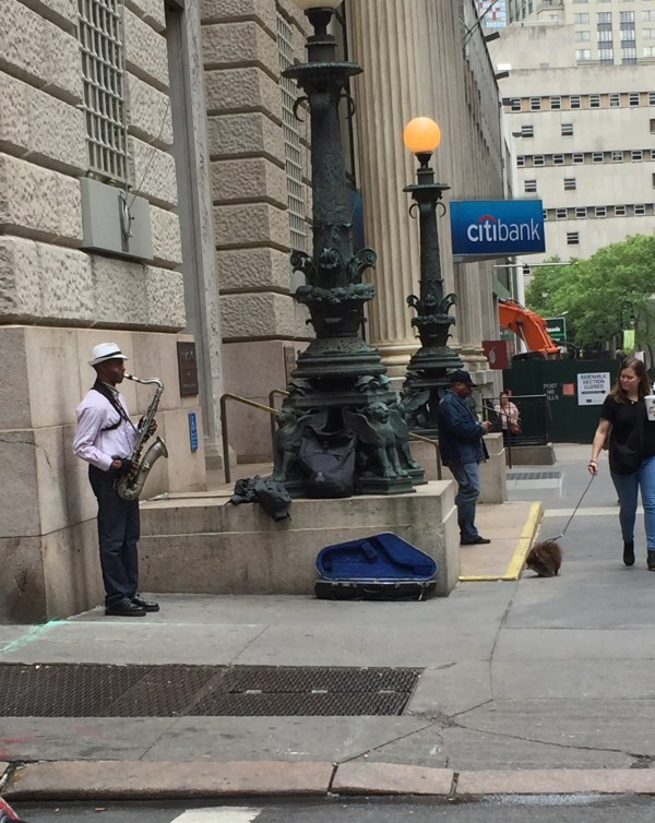 The saxophone player isn’t there today. He usually comes around this time in the afternoon. When he plays, I can hear the music in our apartment, although the corner on which he stands is seven stories down, half a block away, and across the street, in front of the bank. Whenever I hear his notes, I run down and put a few dollars in his case. [Click on title to read the full post.]